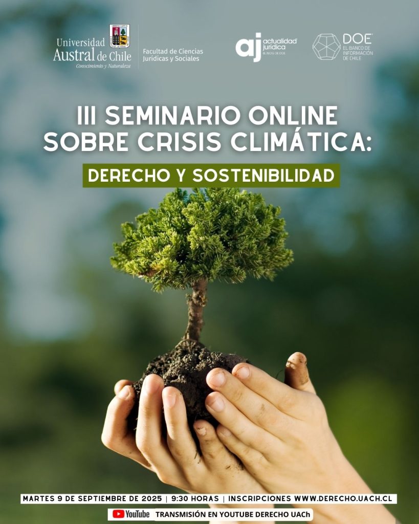 El pasado martes 9 de septiembre se realizó el III Seminario Online sobre Crisis Climática: “Derecho y Sostenibilidad”, organizado por la Facultad de Ciencias Jurídicas y Sociales de la Universidad Austral de Chile, con la colaboración de Actualidad Jurídica, el Blog de DOE, y DOE, el Banco de Información de Chile. La actividad fue coordinada por la profesora María Elisa Morales.