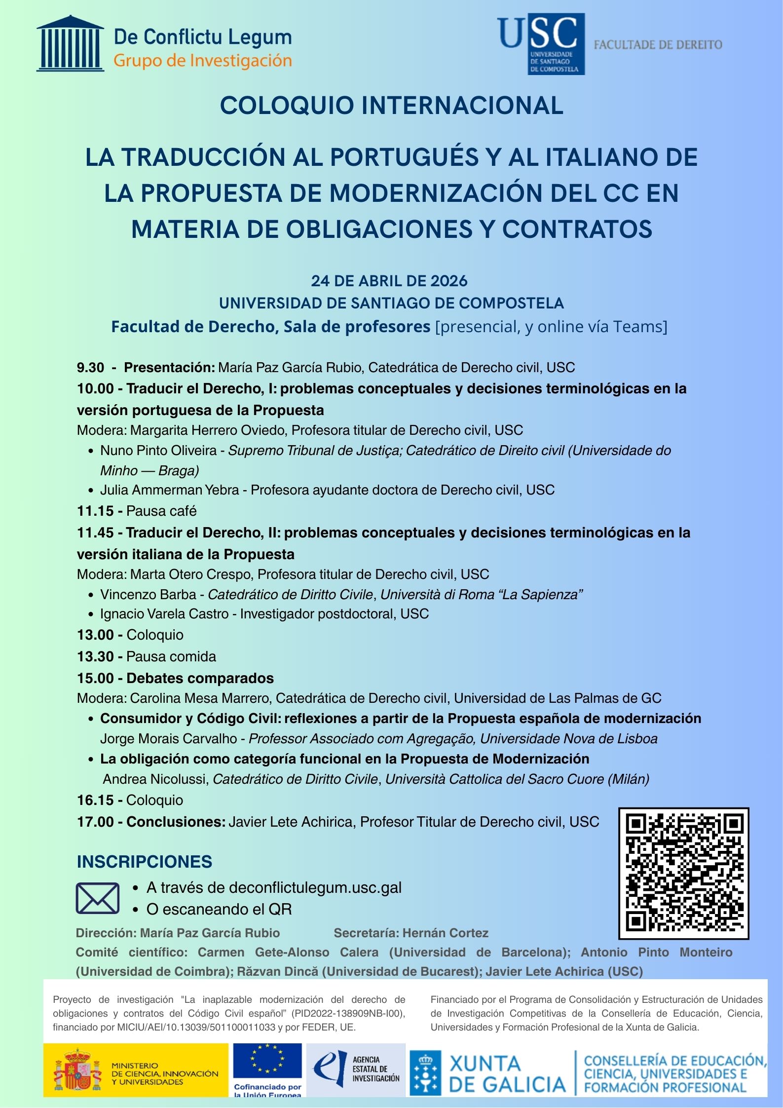 Este coloquio, cuxas conclusións presentará o profesor Javier Lete Achirica, intégrase no proxecto de investigación "A inaprazable modernización do dereito de obrigas e contratos". Máis aló dunha análise técnica, a cita pretende afondar na interacción dogmática da reforma cos sistemas xurídicos da nosa contorna cultural, consolidando un diálogo esencial para o futuro do Dereito civil europeo.