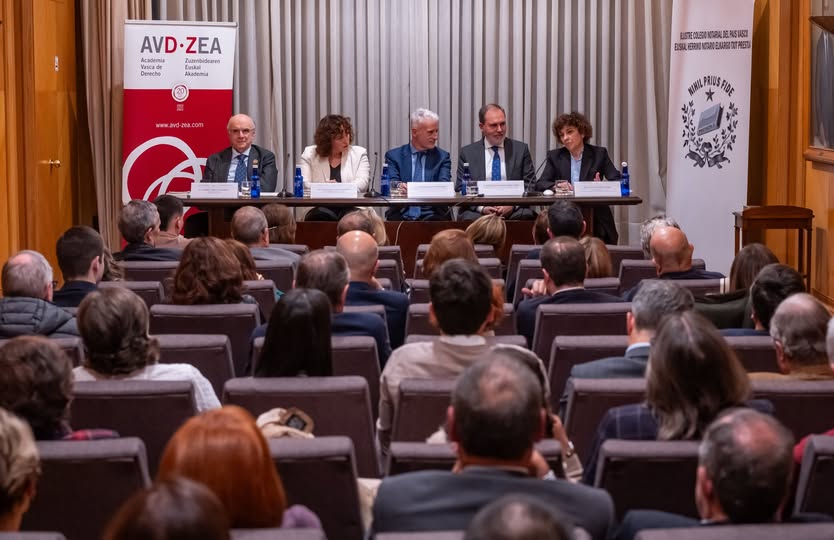 O pasado 20 de novembro, a sede do Colexio Notarial do País Vasco acolleu o tradicional Acto de Apertura do Curso da Academia Vasca de Dereito (AVD-ZEA). A mesa estivo encabezada por Andrés Urrutia, presidente da Academia, acompañado por Maite Barruetabeña, viceconselleira de Emprego Público do Goberno Vasco; Iñaki Subijana, presidente do Tribunal Superior de Xustiza do País Vasco; e Ángel Nanclares, decano dos notarios vascos.
